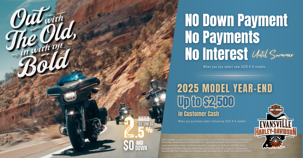 Offers available on select H-D models. Qualifying credit required. APR will vary based on creditworthiness of borrower. Advertised price excludes taxes, title, registration and dealer fees due at signing. Offers cannot be combined. Dealer contribution may affect consumer cost. Customer Cash offer valid on purchase of 2025 Road Glide, 2025 Street Glide, or 2025 Street Glide Ultra. Photos for representative purposes only. Other exclusions and limitation apply, see dealership for details. Offer expires 2/28/2026
